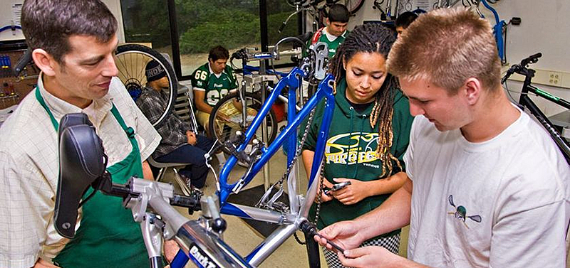 Individuals work with one of our mechanics to overhaul and refurbish a donated bike learning basic mechanical skills in the process.